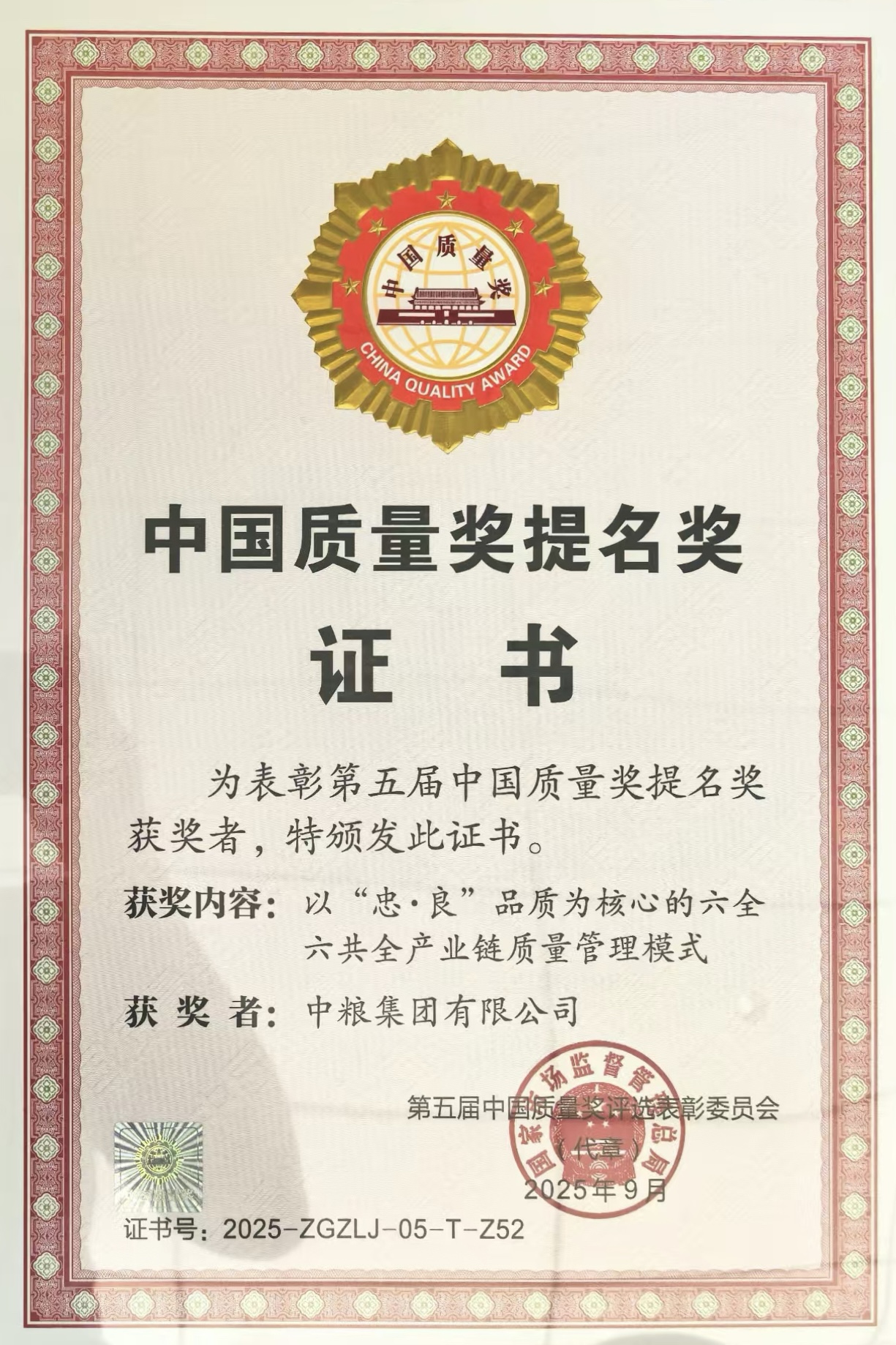 中粮集团获得第六届中国质量奖提名奖,成为唯一获奖的央企总部。